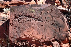 Although not as representational as the Burrup petroglyphs, the Ewaninga Conservation Reserve, about 35km south of Alice Springs, contains about 1000 petroglyphs. These are distributed among the rock outcrops to the south and south-east of the claypan and consist of circles, lines and other geometric motifs. There are also some examples of animal tracks.