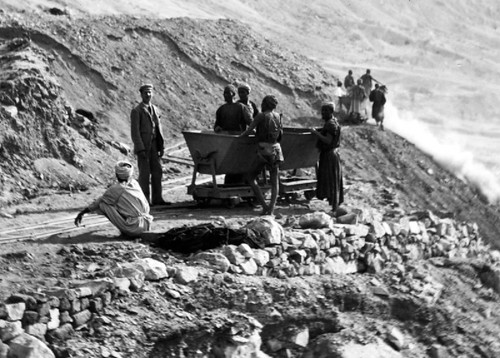 Howard Carter is seen here supervising a group of workmen moving material cleared from the temple site in one of the Decauville cars which Naville borrowed from the Service des Antiquities along with 460 metres of tramway. This photograph was taken in 1893, during excavations at Deir el Bahri.