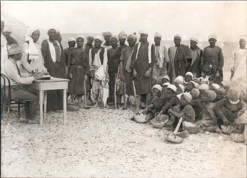 Andrew Bednarski in ‘The EES:the early years’ says about this photograph: “This view of pay-day at Balabish is typical of scenes on excavations in Egypt until fairly recent times. The director, Gerald Wainwright, sits behind a table with the workmen gathered before and around him, waiting to be paid. Most of the workmen have the tools of their trade, the hoe and basket, and wear traditional Egyptian dress, in contrast to the rather formal western clothes (including a tie) of Wainwright.”