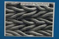 In this image it clearly shows the differences in the quality and textures between the ancient Greek and the 19th century wire used to restore the necklace.