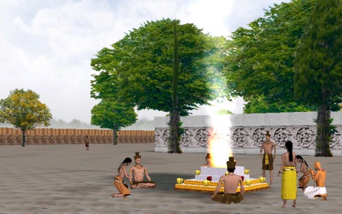 Things To Do, Interaction &Information – There are quite a bit of ‘game characters’ (NPCs) running around in Virtual Sambor Prei Kuk, making their way to the sanctuary, trying to sell you animals and other products or praying. This – together with good sound integration – definitely adds to the ‘immersionalist’ experience. Your avatar can do certain animations such a praying, waving and jumping, but there is nothing ‘real’ to do. No opening of doors, shoving someone annoying aside or sitting down to join the prayers at the camp fire. And only to often I stood before a virtually recreated ancient building, wondering ‘What was the use?’ or looked at people wondering what they were doing*. Yet, no way to retrieve more information from in-world? Here there definitely is still room for improvement.