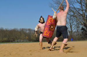 The 20 students at Regensburg, together with four trainers from the department of sports science, started their gladiatorial training in March in a modern sports hall but will soon progress to fighting on sand. During August they will spend a month living a more authentic gladiator’s life.