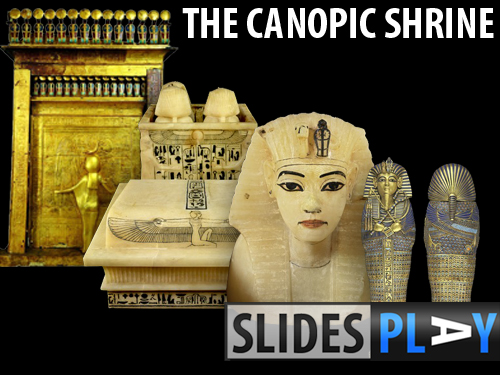The Canopic Shrine is a large gilded wooden box flanked by a Canopy and supported on a sledge. Inside the shrine was the Canopic Chest, which has four hollowed spaces inside which are sealed by Human-Headed Stoppers. Inside the hollows were four small Canopic Coffinettes.