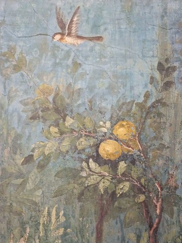 I couldn’t help but compare the beautiful garden fresco from the House of the Golden Bracelet displayed in this exhibit with the frescoes from the triclinium of the Villa of Livia I had seen at the Palazzo Massimo Alle Terme of the Museo Nazionale Romano in Rome this past March. Enclosed by a simple wicker fence, Livia’s garden contains a luxuriant mixture of trees and plants including laurel, palms, fir, and fruit trees like pomegranates as well as many different species of birds and flowers. Although both are beautifully rendered, I think I prefer Livia’s version without the intruding herms and theater masks.