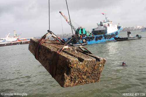 A huge granite block, believed to be part of a temple belonging to Egyptian queen Cleopatra, has been lifted from the sea at Alexandria. The nine-tonne stone, quarried in Aswan some 700 miles south of the city, is expected to be transported to a new museum celebrating the sunken city. The block is thought to have been the pillar of a temple to Isis at Cleopatra’s palace. Alexandria became a centre of commerce and education during antiquity, but was razed by a 4th century AD earthquake. The stone is one of a series of underwater discoveries made by the Greek…