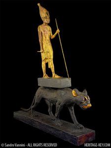 These small statuettes of the famous boy king Tutankhamun astride a panther came in a pair and were located along with 32 other ritual figures inside a black resined wooden box in the treasury section of Tut’s tomb, KV62, in the Valley of the Kings. Like all of the statuettes, they are believed to have had a ritual and religious significance. The ancient Egyptians expected them to aid the young pharaoh’s passage to the afterlife.
