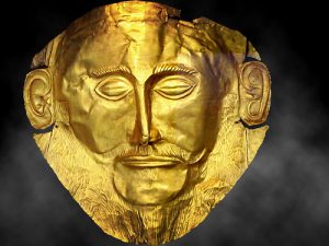 This so-called mask of Agamemnon is the best known of Schliemann’s finds from the royal tombs at Mycenae. The graves are certainly royal. The faces of the men are not all covered with masks. That they are men, and warriors, is indicated by the weapons in their graves. The quantities of gold and carefully worked artifacts surely denote honor, wealth and status.