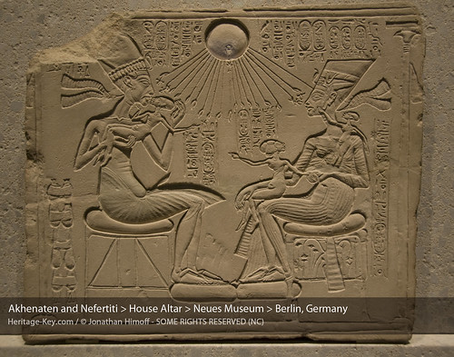 This beautiful stela from Amarna encapsulates the Amarna artistic style and the religion of the Aten in one place. It is not the only one of its kind, but it is one of exceptional workmanship and is in remarkable condition. Along with the bust of Nefertiti, it’s one of the highlights of the newly-opened Neues Museum in Berlin. The stela, or house altar, shows a relief of the royal family, with Nefertiti on the right, sitting opposite and facing her husband Akhenaten, with their three eldest daughters, Meritaten, Meketaten and Ankhesenpaaten, upon their laps. They are all seated beneath the…
