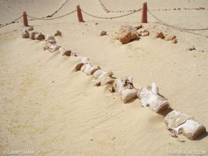 The key find in this highly significant paleontological site was hundreds of fossils of an early, now extinct form of whale, named archaeoceti. Although not the earliest examples to be discovered in the world, the concentration of these remains and their level of preservation, which enabled scientists to study their stomach contents, has contributed to our understanding of the early stages of life on earth immeasurably. Unlike other fossils found elsewhere, some of the archaeoceti in Walid al-Hatin had skeletons with back legs and feet, providing a compelling picture of the evolutionary stages the whale went through as it changed from a land to sea mammal. Alongside these early whales, fossils of fifteen species of wild mammals, 19 reptiles and 36 breeds of bird have been found on the site, enabling paleontologists to construct a detailed picture of the environment of the time.