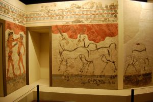 Minoan art is also well known. The palace at Knossos contains numerous frescoes depicting dolphins, rosettes and of course the famous bull-leaping scenes.