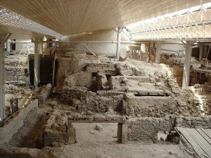 We know that they traded with Egypt, the Near East and mainland Greece. Indeed the town of Gournia – on the north coast – had facilities for bronze-working and wine making. It also had a substantial ship-shed (harbor) that berthed vessels coming to and leaving the island. A recent find at the site of Raos, also on Santorini, shows that they even traded in gold.